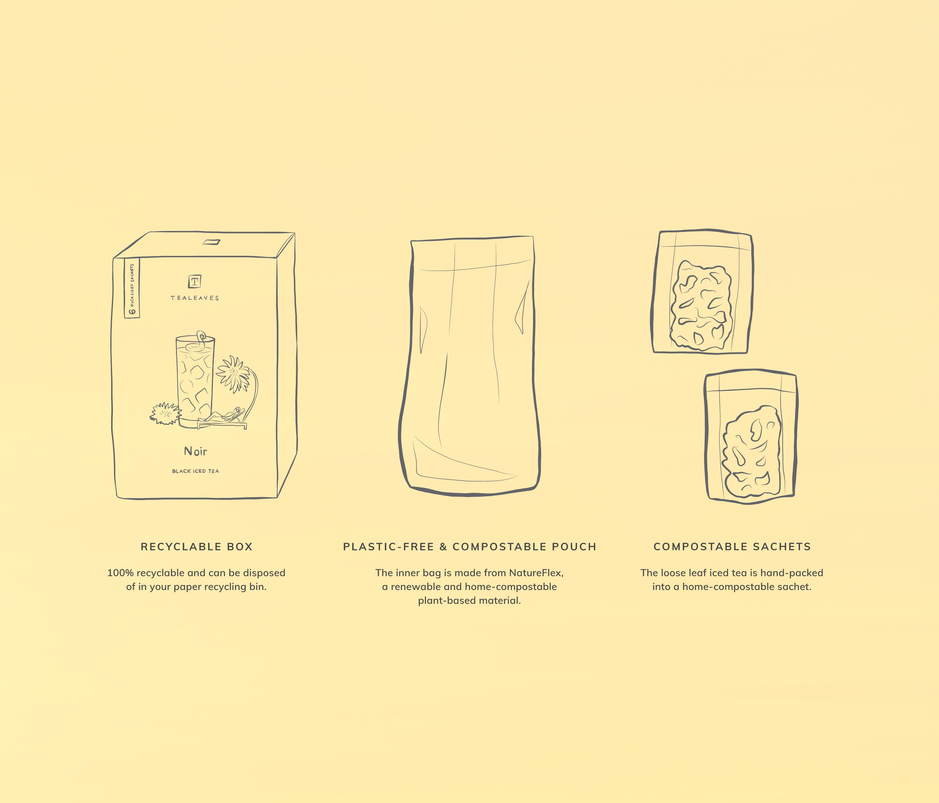 At TEALEAVES, details matter. Born from Nature, our tea feels most at home cradled by materials as natural as they are. Seeking to make our footprint as small as possible, our box is 100% recyclable while the inner pouch, made from a renewable plant-based material, is home compostable. If that was not enough, the iced tea sachets themselves are lovingly packed by hand into unbleached, home compostable paper as well. These choices help us to sleep in a world better for all.